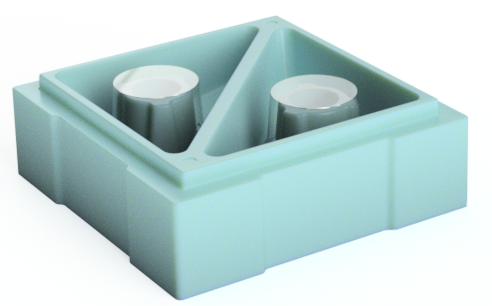 Кормушка состоит из двух отделений объемом по 1л, в центре каждого из которых находится «стакан» — вертикальный цилиндрический коридор, по которому пчелы поднимаются на кормление.