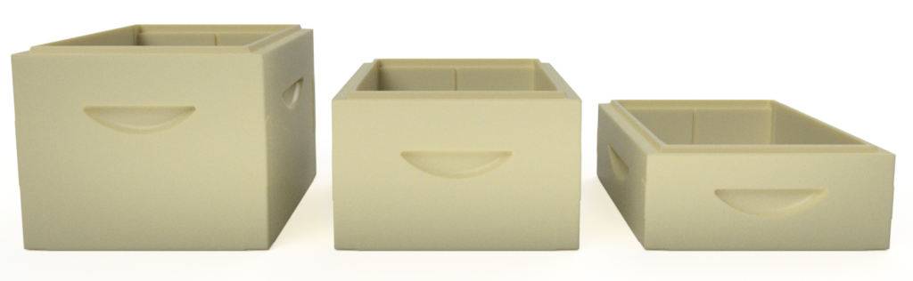 Комплект пресс-форм на корпус состоит из двух форм — форма торцевой стенки и форма боковой стенки. Обе пресс-формы состоят из двух полуформ, соединяемых рычажными или петлевыми защелками. Обращаем внимание, что боковые стенки являются универсальными и подходят также для 6-, 10- и 12-рамочных ульев.